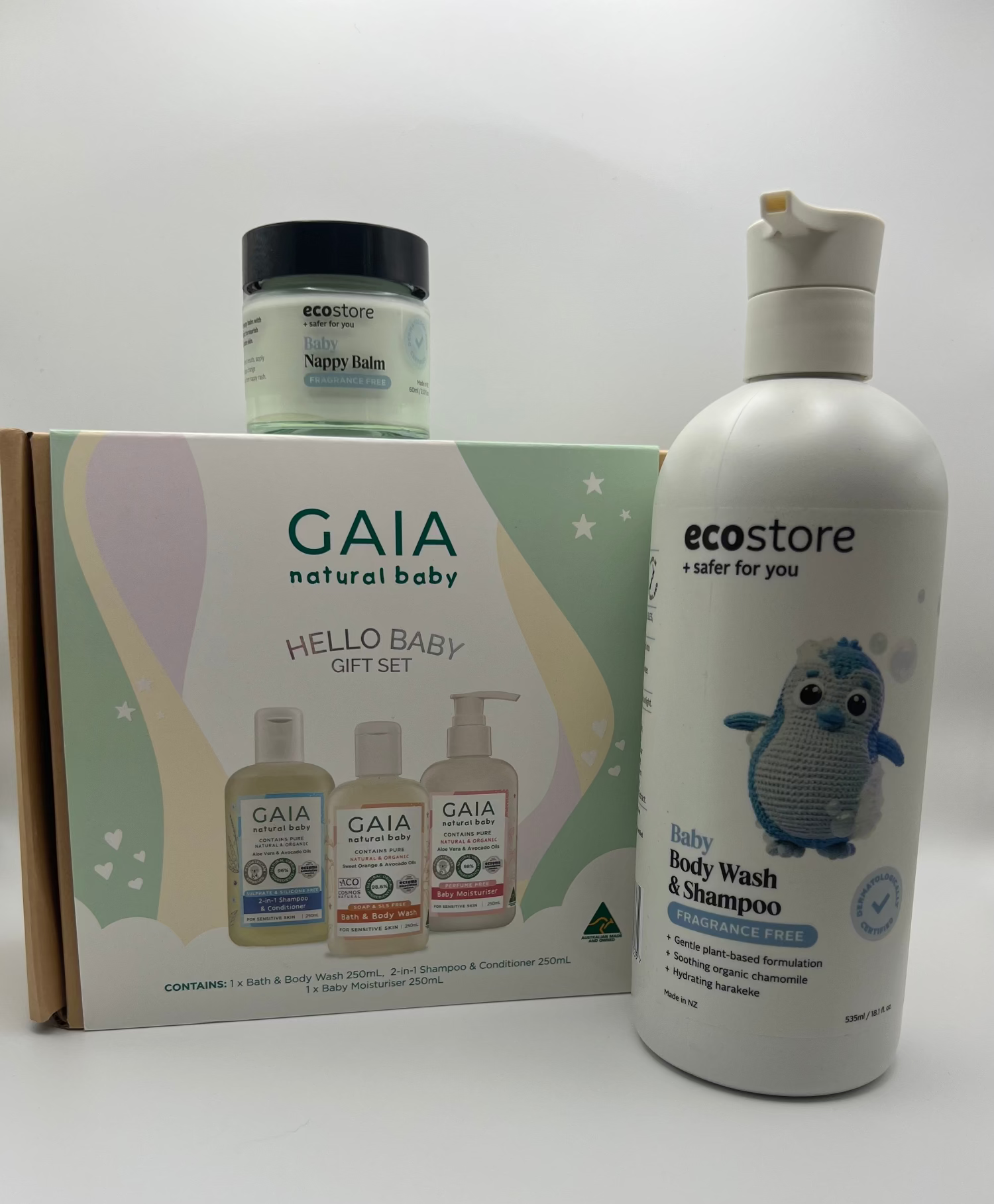 - Choice between Ecostore Body Wash & Shampoo (535mL) and Ecostore Nappy Balm (60mL), OR Gaia Set including 2-in-1 Shampoo & Conditioner (250mL), Bath & Body Wash (250mL) and Baby Moisturiser (250mL)